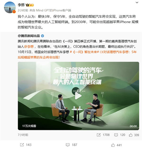 2025-10-16杀掉驾校!李想:全自动智能汽车最快3年内问世