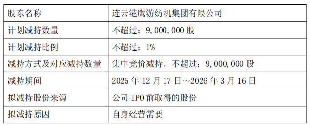 中国经济网北京11月26日电 中复神鹰(688295.Sh)昨晚披露股东减持计划公告。截至公告日,公司股东连云港赢友纺织机械集团有限公司(以下简称“赢友集团”)持有公司无限售条件传统股39,990,306股,占公司公司总股本的4.45%。上述股份来源于公司首次公开发行股票前已购买的股份,自2025年4月7日起已全部上市配发。因自身经营需要,盈友集团拟通过集中竞价交易方式减持公司股份,合计不超过900万股,即不超过公司总股本的1%。公司。上述减持计划将于公告之日起十五个交易日后三个月内实施,期间为2025年12月17日至2026年3月16日。中复神鹰于2022年4月6日在上海证券交易所科创板挂牌上市,发行股份数量为1亿股,全部为新股。不转让旧股。发行价格为29.33元/股。该库存目前处于销毁状态。中复神鹰的保荐机构为国泰中安证券股份有限公司,保荐代表人为周舟、邱鹏;联席主承销商为国泰中安证券股份有限公司和中国国际金融公司。中复神鹰发行募集资金总额29.33亿元,募集资金净额27.77亿元。中复神鹰实际净募资比原计划多9.32亿元内德筹集资金。中复神鹰2022年3月3日披露的招股书注册稿显示,公司拟募集资金18.45亿元用于西宁年产万吨高性能碳纤维及配套丝丝项目、航天高性能碳纤维及原纤纤维试验项目、纤维航空应用研发及性能补充工作、纤维航空应用研发及性能补充工作、纤维航空应用MGA补充工作纤维纤维的研发及性能、补充工作。中富神鹰发行费用为1.56亿元,其中高泰君利证券有限公司获得保荐费66.04万元,高泰君尼证券有限公司、中国国际金融公司获得承销费1.38亿元。 2025年4月11日,国泰海通证券股份有限公司重组更名暨上市仪式d在上海证券交易所举行。上海证券交易所与国泰海通签署《证券上市协议》。国泰海通证券股份有限公司A股证券简称由“国泰城安”正式变更为“国泰海通”,A股证券代码“601211”保持不变。此次保险简称变更,标志着高泰君宁与海通证券合并重组已完成全部手续。
